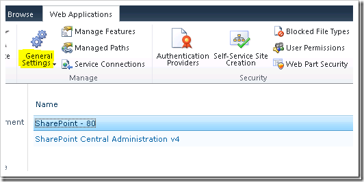 Select one of your Web Applications and then select “General Settings” from the Ribbon.